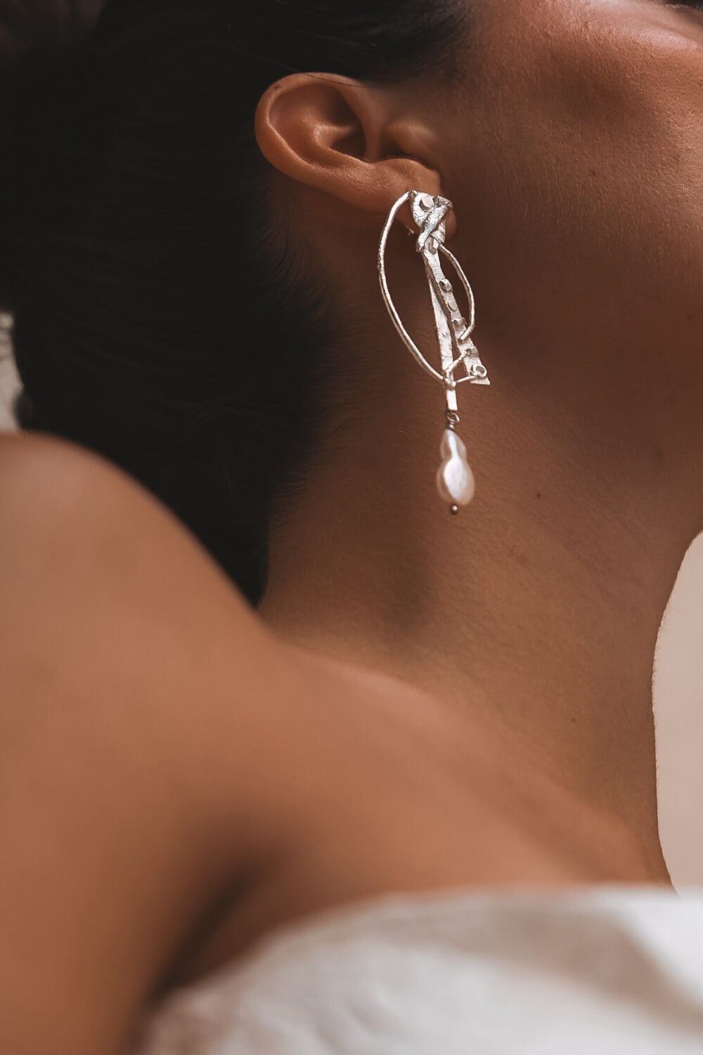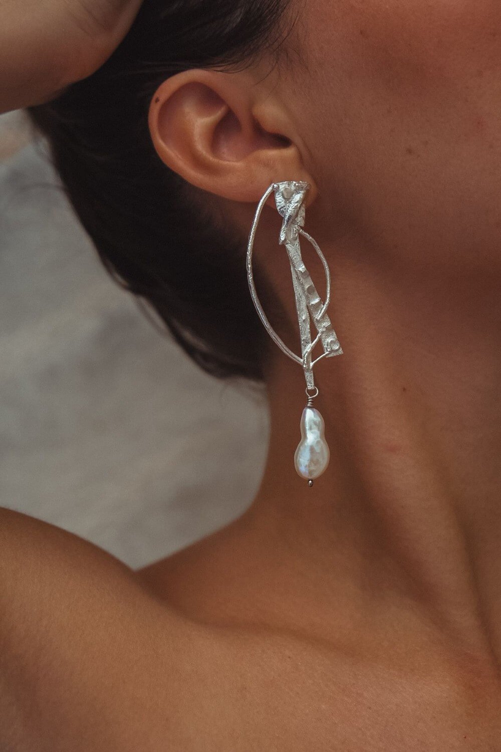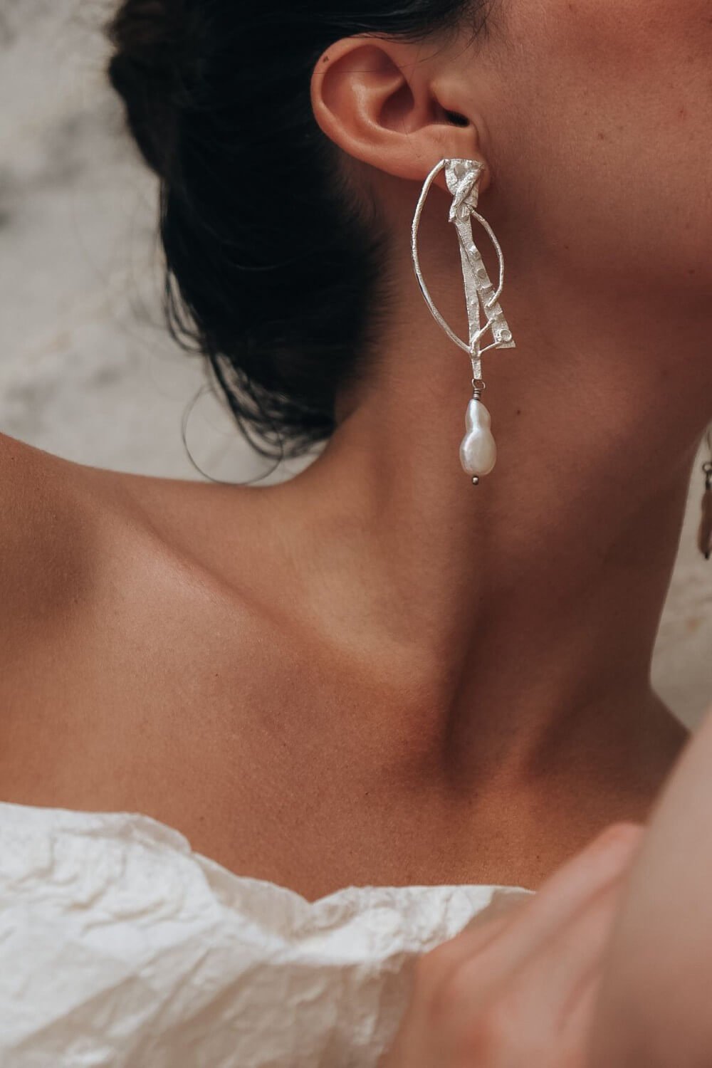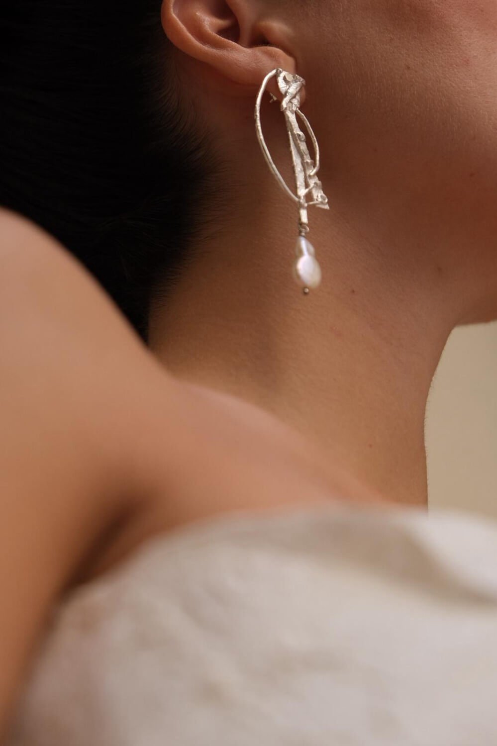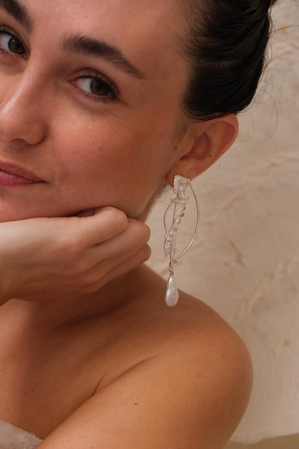 Pendientes únicos con técnica fusing y reticulado, y perlas barrocas.